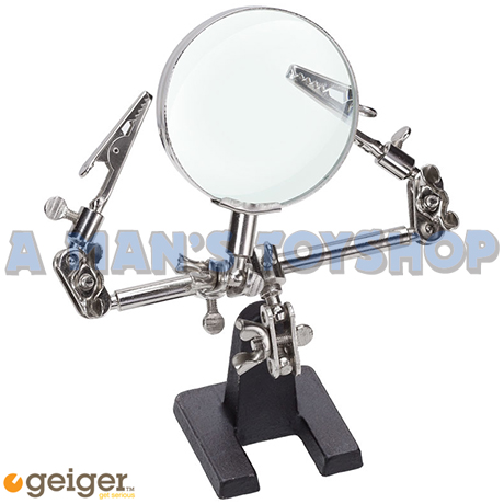 THE "HELPING HAND" OR "THIRD HAND" MAGNIFYING GLASS IS IDEAL FOR SMALL TASKS SUCH AS WIRE SOLDERING, ELECTRICAL CIRCUITRY OR ANY MINIATURE JOB REQUIRING PRECISION ASSEMBLY. IT FEATURES A STURDY CAST IRON BASE, TWO ARTICULATED ALLIGATOR CLAMPS AND MAGNIFYING GLASS.